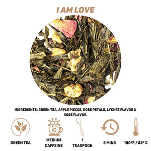Introducing "I am Love," a blissful and delightful blend of wellness in the form of tea. Crafted with care, this unique blend combines the refreshing essence of green tea with the delicate sweetness of rose petals and apple pieces. To add an exotic twist, we've infused the tea with the sensational aroma and flavor of lychee.